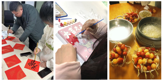 祥龙辞岁福泽满,金蛇迎春瑞气盈。大家坐在一起分享生日蛋糕,画着饱含新年祝福的数字油画,玩“狼人杀”“不要做”挑战等小游戏;大家亲手熬糖、挂糖,制作了一串串晶莹剔透、红亮诱人的水果冰糖葫芦,瞬间勾起心底最温暖的儿时回忆。活动现场节日氛围浓厚,甜蜜与欢乐同行,咸宁分部全体员工感受到了“大家庭”的温暖。